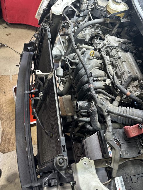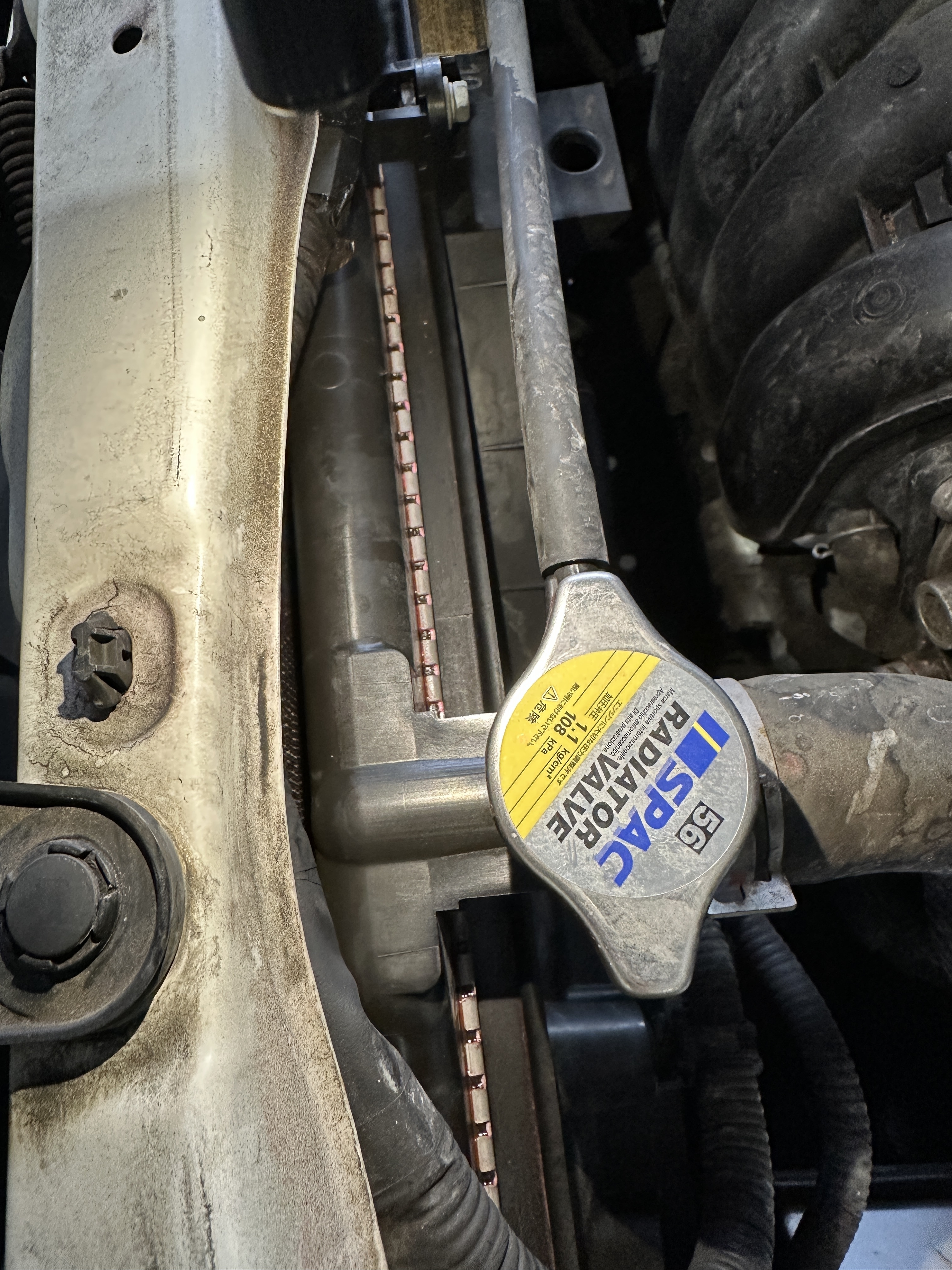 ボンネットを開けて見てみると、ラジエター経年劣化によりアッパータンクから冷却水が漏れていました。